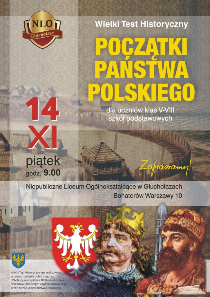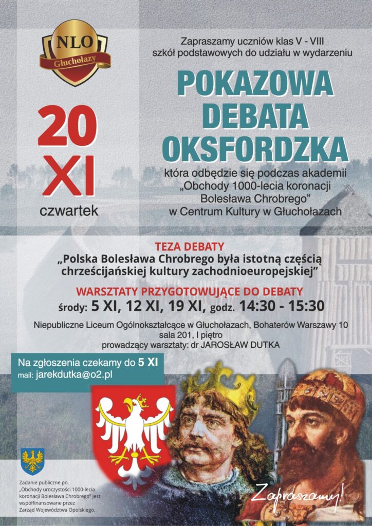 Zapraszamy do udziału w Wielkim Teście Historycznym oraz warsztatach przygotowujących do Pokazowej Debaty Oksfordzkiej. Obydwa działania są częścią obchodów 1000-lecia koronacji Bolesława Chrobrego, które odbędą się 20 listopada. Zgłaszajcie się, bo poza poszerzaniem swojej wiedzy i zdobywaniem nowych kompetencji i umiejętności macie szansę na zdobycie cennych nagród. Organizatorem obchodów jest Stowarzyszenie na Rzecz Szkół „Chrobry” oraz Niepubliczne Liceum Ogólnokształcące w Głuchołazach, wspóorganizatorem Instytut Śląski i chór Capricolium, a współfinansuje je Urząd Marszałkowski Województwa Opolskiego. Zapraszamy do zgłoszeń!