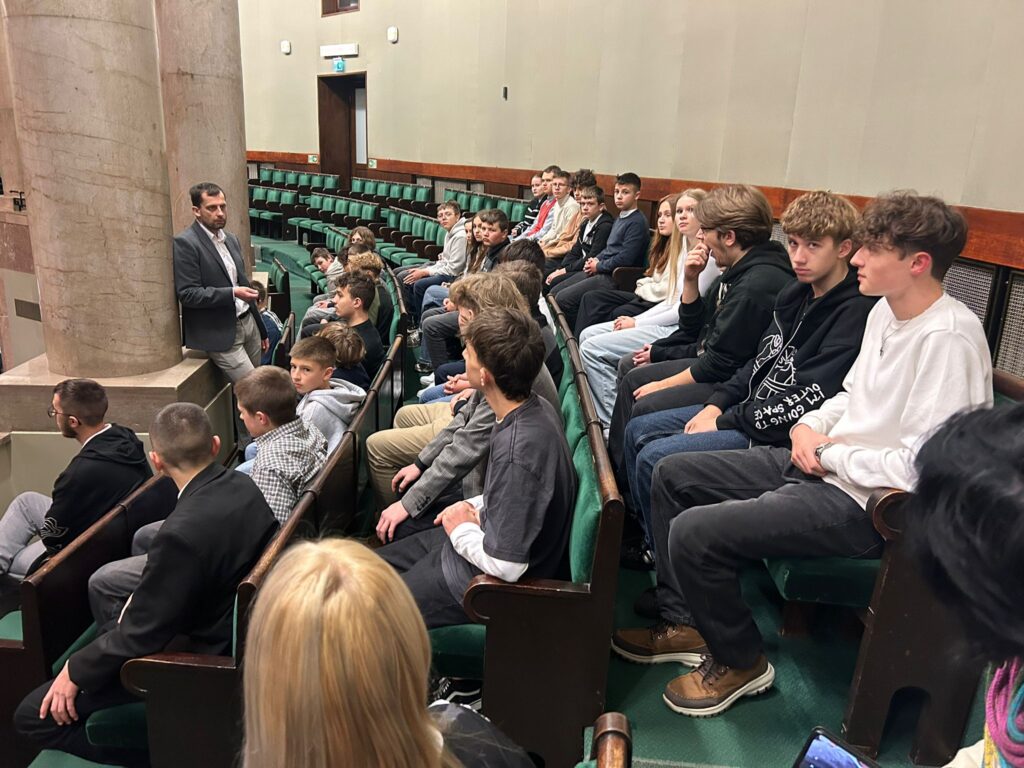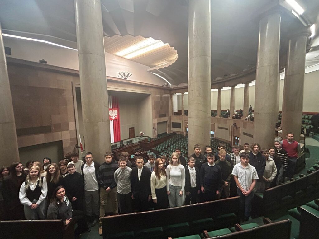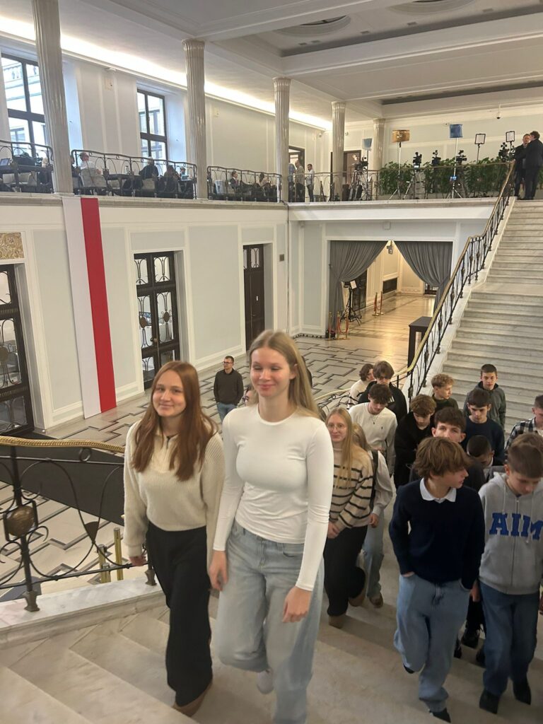Po raz kolejny odwiedziliśmy Sejm RP. Tym razem wspólnie z uczestnikami i zwycięzcami Wielkiego Testu Historycznego organizowanego w ramach obchodów 1000-lecia koronacji Bolesława Chrobrego, naszymi kolegami ze szkół podstawowych. Po gmachu Sejmu oprowadzał nas przewodnik, objaśniał nam życie Sejmu „od środka”, poznaliśmy ciekawostki dotyczące funkcjonowania tej instytucji oraz wysłuchaliśmy informacji o jej historii. Po zwiedzaniu zaproszono nas na obiad w restauracji sejmowej. Odbyliśmy również spacer Krakowskim Przedmieściem, po czym udaliśmy się do Muzeum Narodowego na umówione wcześniej lekcje muzealne. Muzeum zrobiło na uczniach ogromne wrażenie, koniecznie musimy tutaj powrócić.